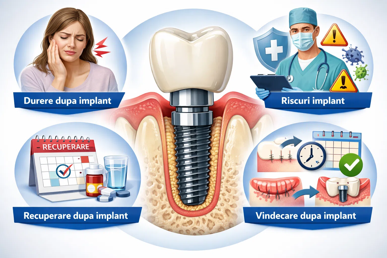 Printre situatiile care pot aparea se numara inflamatia tesuturilor din jurul implantului, integrarea incompleta a implantului in os sau reactii temporare dupa interventie, cum ar fi umflarea, sensibilitatea sau sangerarea usoara. Factorii care pot influenta aceste riscuri includ igiena orala deficitara, fumatul, afectiunile gingivale netratate sau unele probleme generale de sanatate.